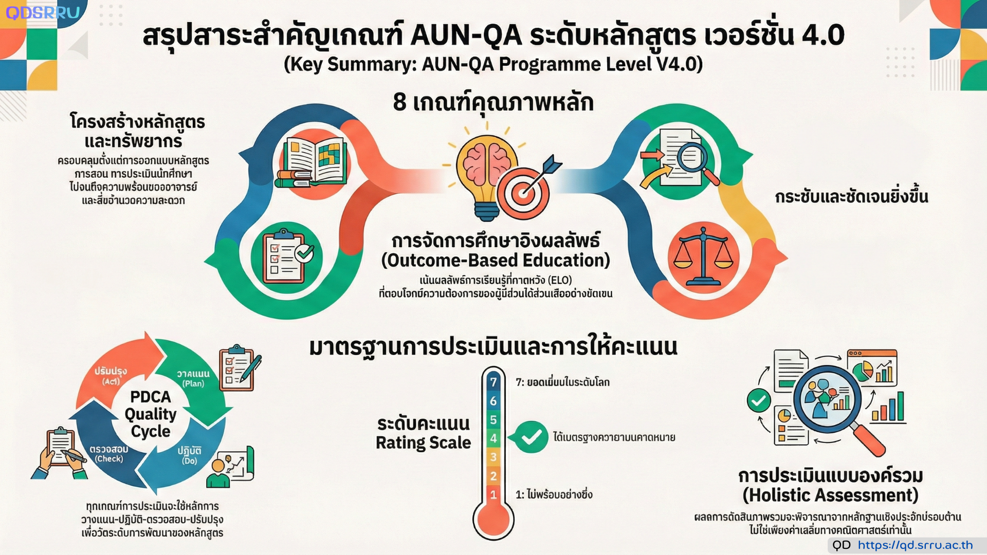 คู่มือการประกันคุณภาพการศึกษาของเครือข่ายมหาวิทยาลัยอาเซียน (AUN-QA) ฉบับที่ 4.0 ซึ่งเน้นการประเมินคุณภาพในระดับหลักสูตรเป็นสำคัญ เนื้อหาครอบคลุมเกณฑ์การตัดสิน 8 ด้าน ตั้งแต่ผลลัพธ์การเรียนรู้ที่คาดหวัง โครงสร้างหลักสูตร วิธีการจัดการเรียนการสอน ไปจนถึงสิ่งสนับสนุนการเรียนรู้และผลผลิตของบัณฑิต คู่มือชุดนี้จัดทำขึ้นเพื่อเป็นแนวทางให้สถาบันอุดมศึกษาใช้ในการทำ การประเมินตนเอง (SAR) และเตรียมความพร้อมสำหรับการตรวจสอบจากหน่วยงานภายนอก โดยยึดหลักวงจร PDCA เพื่อมุ่งเน้นการพัฒนาคุณภาพอย่างต่อเนื่อง นอกจากนี้ยังมีการกำหนดเกณฑ์การให้คะแนนแบบ 7 ระดับ เพื่อใช้วัดมาตรฐานการดำเนินงานตามตัวบ่งชี้ต่าง ๆ อย่างชัดเจน ท้ายที่สุดเอกสารได้ระบุแนวทางเพิ่มเติมสำหรับการประเมิน หลักสูตรระดับบัณฑิตศึกษา ที่เน้นการทำวิจัยเพื่อให้สอดคล้องกับบริบทเฉพาะทางของการศึกษาระดับสูงในภูมิภาคอาเซียน