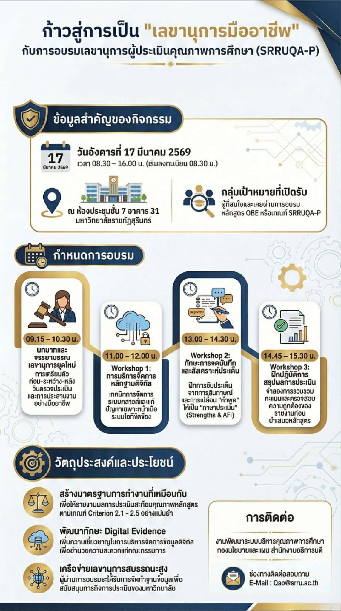 การอบรมเชิงปฏิบัติการ “ก้าวสู่การเป็นเลขานุการมืออาชีพ” เลขานุการผู้ประเมินคุณภาพการศึกษา(SRRUQA-P)